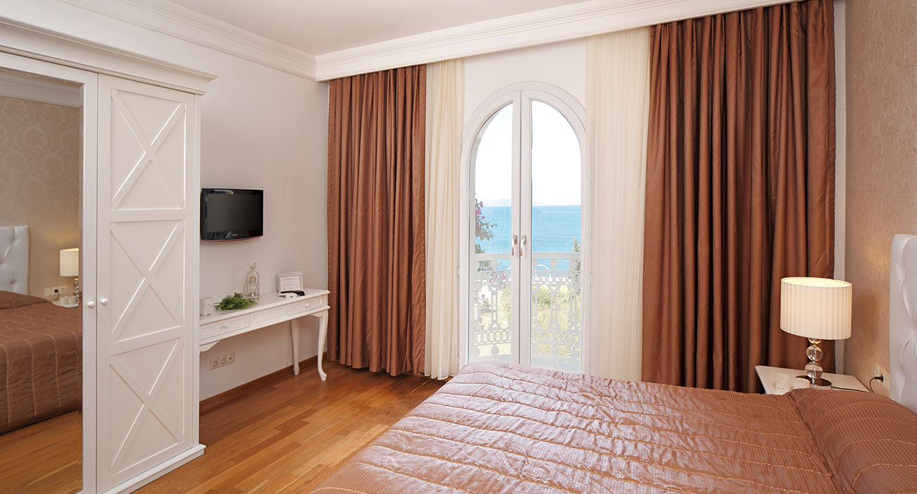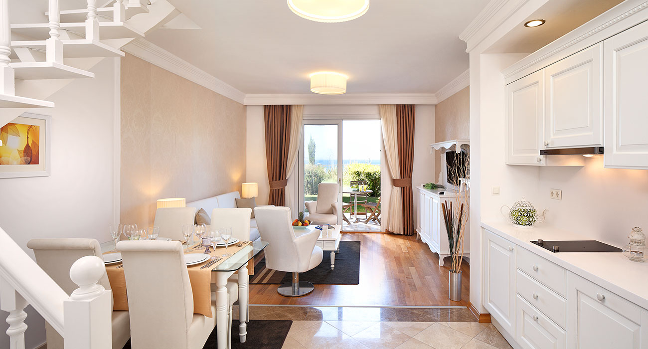 In duplex villas consisting of 2 bedrooms, 1 living room or 3 bedrooms, 1 living room; the first room has 1 large double bed and the other room has a single bed, the bathroom has a shower and bathtub, hair dryer, central air conditioning and the floor is parquet and marble. Minibar, safety deposit box and Wifi are available.
